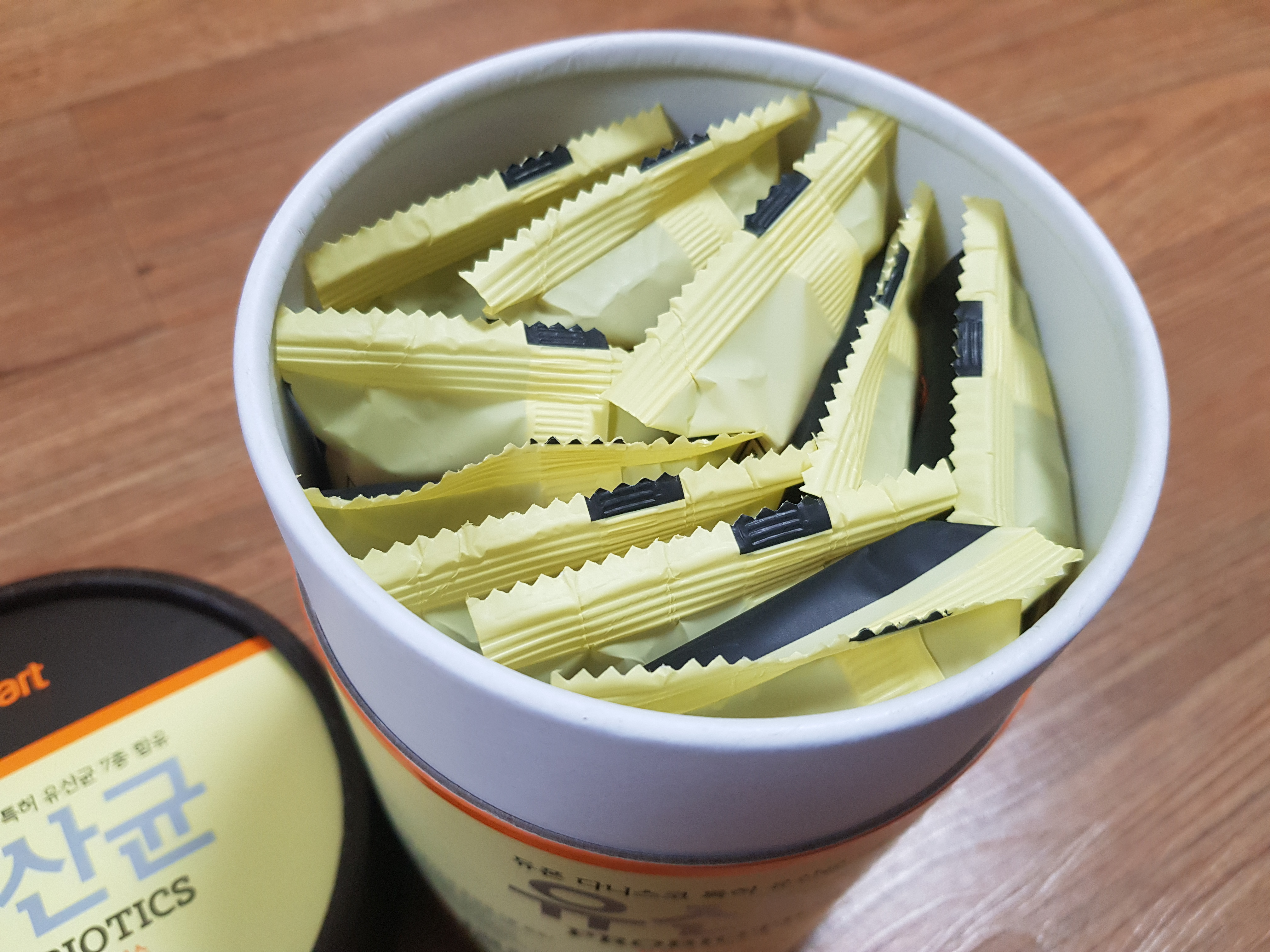 많아 보이지만 10개 X 10봉으로 100포이고 하루 3포씩이니 1개월치입니다. 정으로 된 것보다는 맛은 있지만 부피가 큽니다. 요즘 선물로 받은 유산균들이 몇개 있는데 비교해보겠습니다.