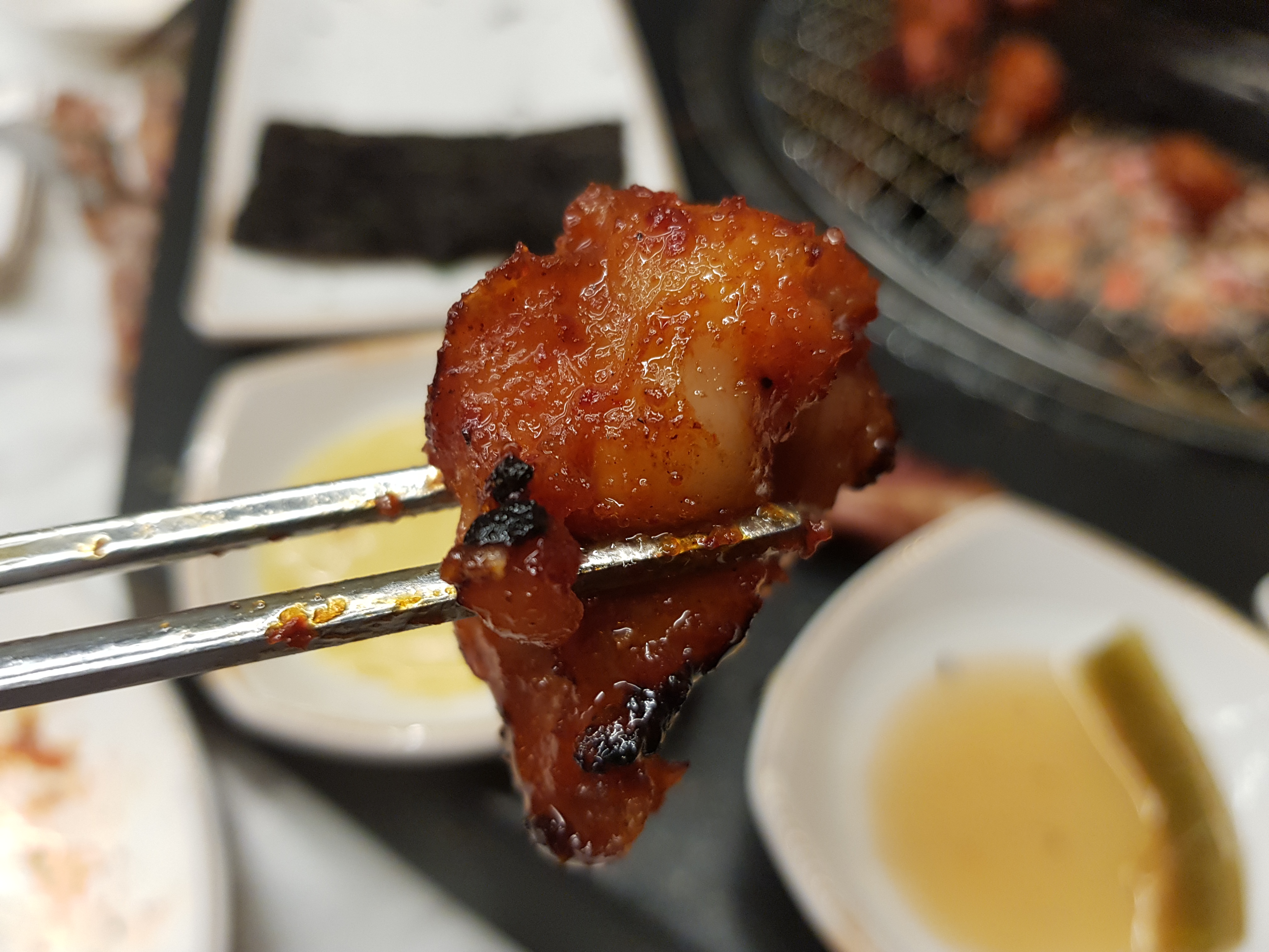 2인분이지만 양이 많지 않습니다. 이렇게 잘 익은 닭갈비를 점원이 알려준대로 김으로 싸서 또 한잔을 했습니다. 닭보다는 돼지고기 같은 느낌이랄까요? 담백하면서 깔끔한 맛입니다.