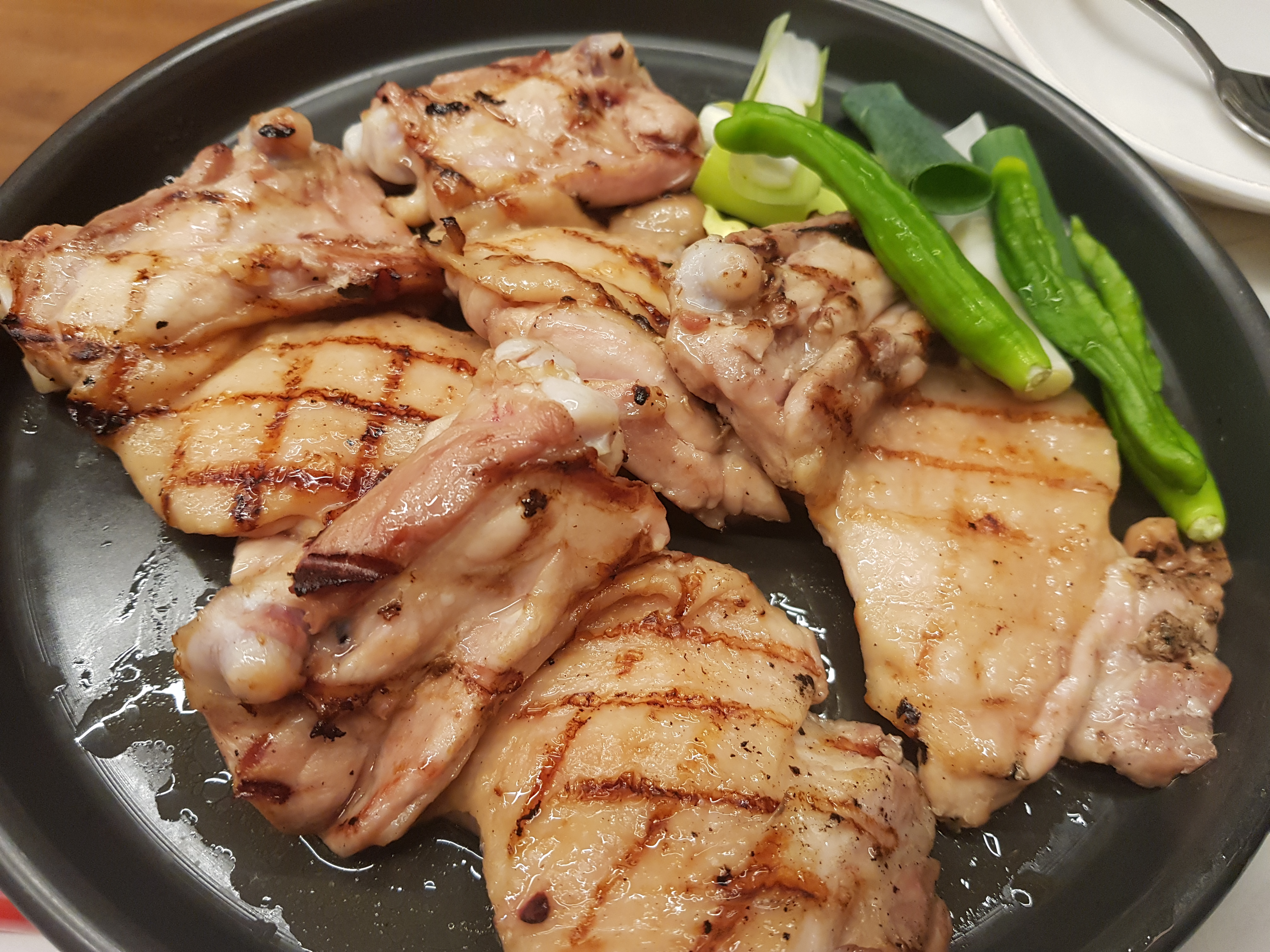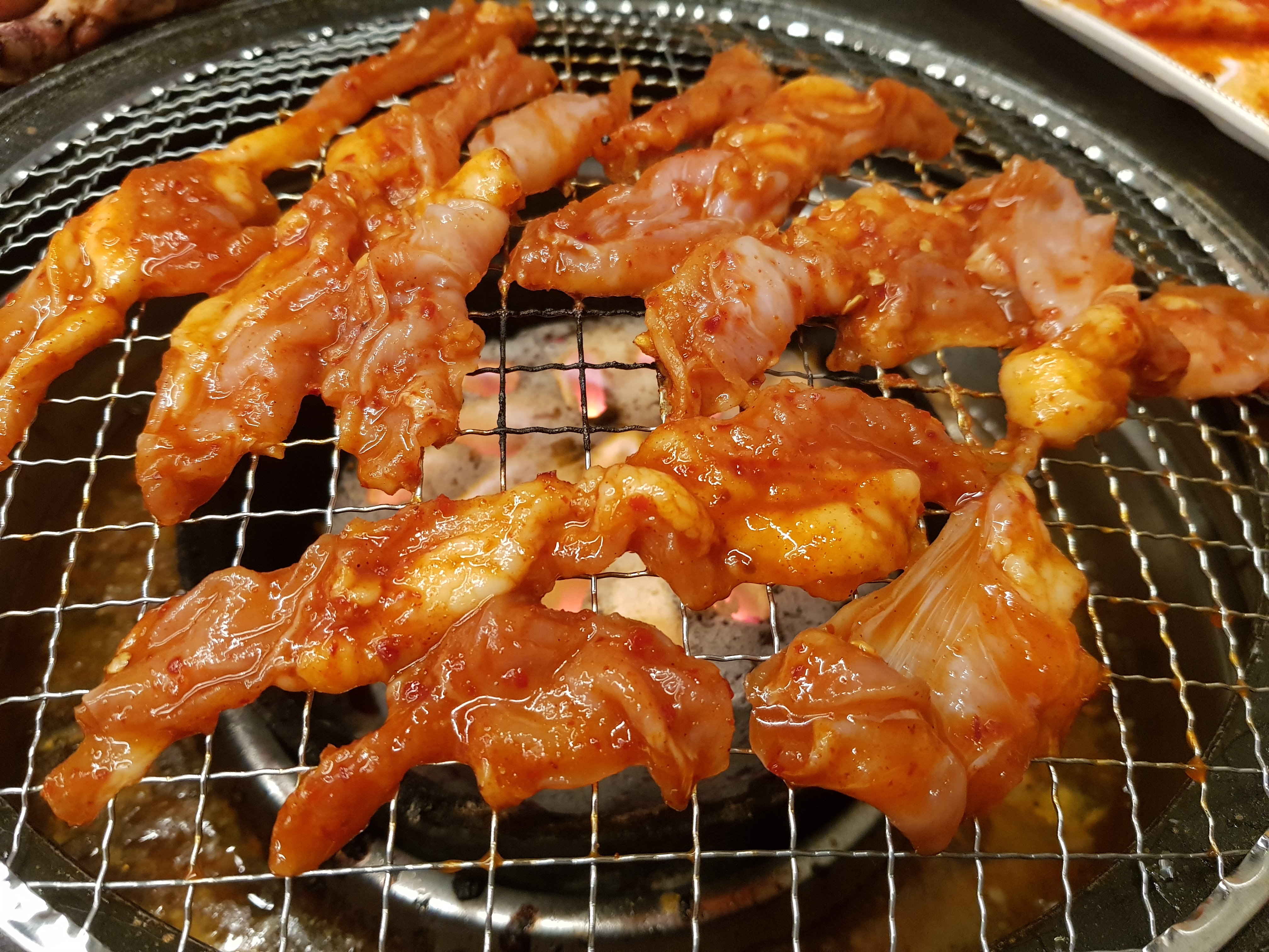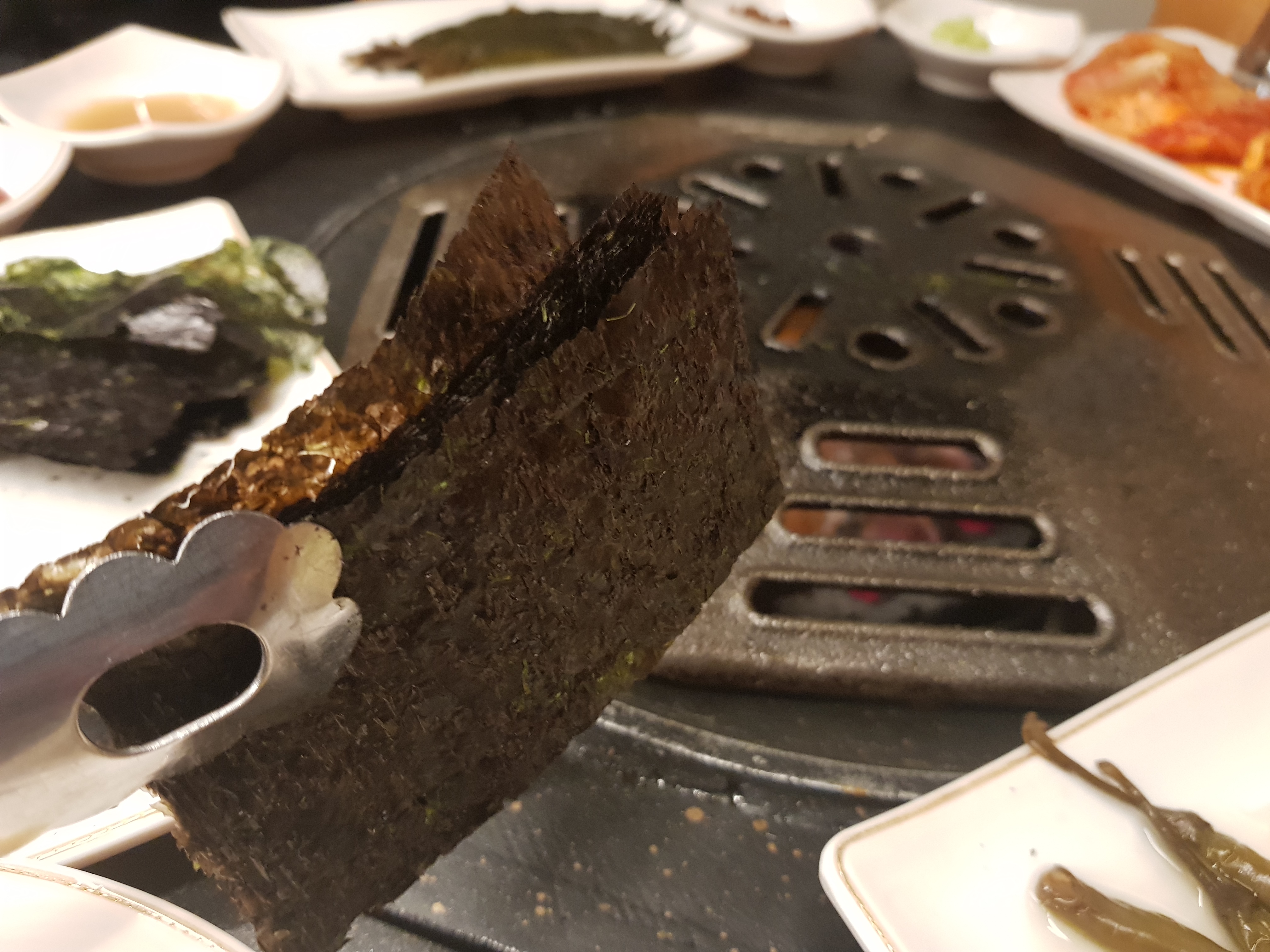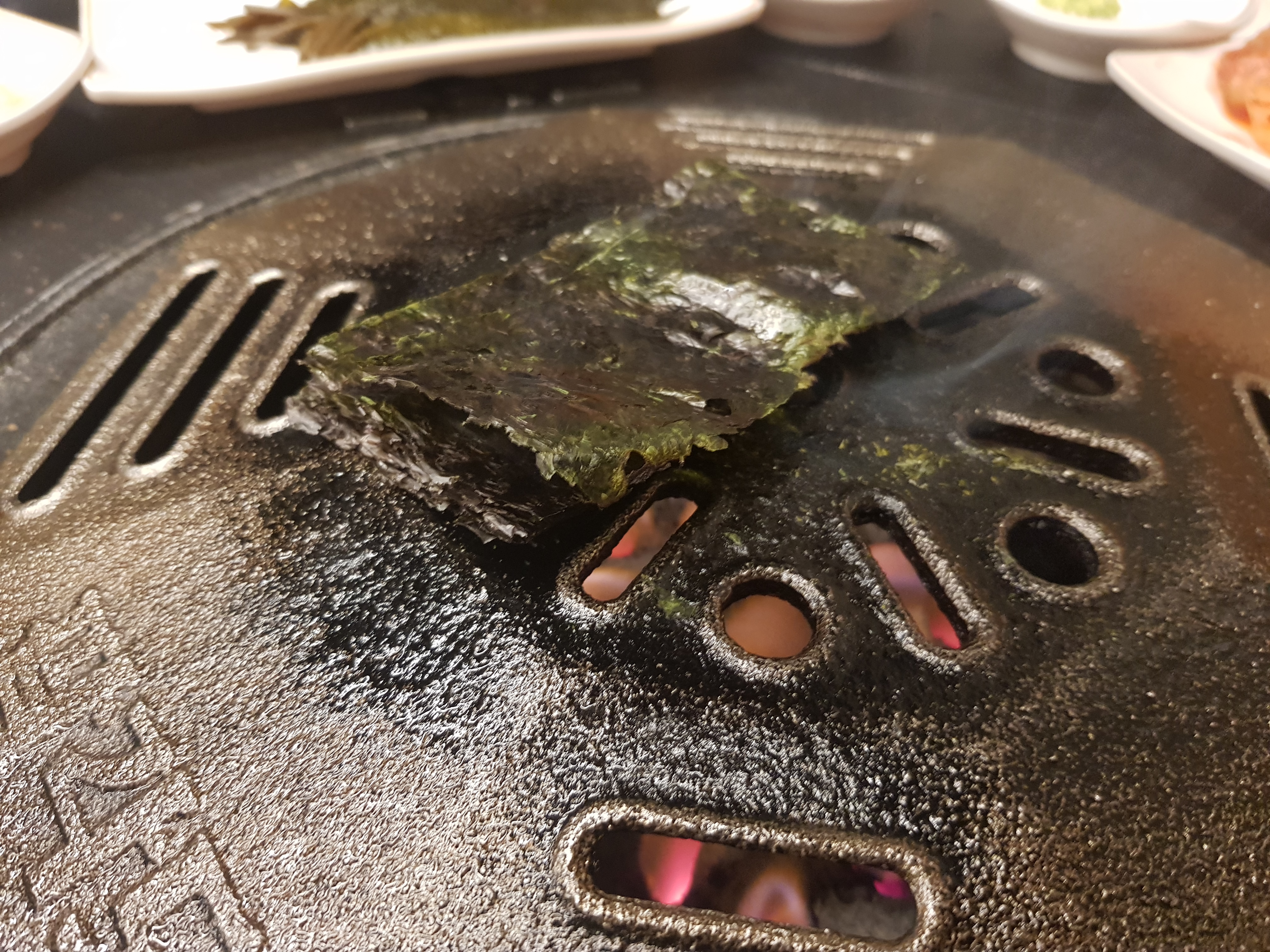 닭갈비가 초벌해서 나오는데 그동안 생김이 있는데 이걸 미리 구워놓습니다. 쌈대신 김으로 싸먹는 곳입니다. 초벌해서 나오다보니 약간 시간이 걸리는 편입니다. 김을 다먹고 또 달라고 했습니다. 김은 '무한리필~' 됩니다. 김을 타지 않게 굽고 나온 초벌구이된 닭갈비를 올려주고 직원이 대파와 꽈리고추를 더 올려줍니다.