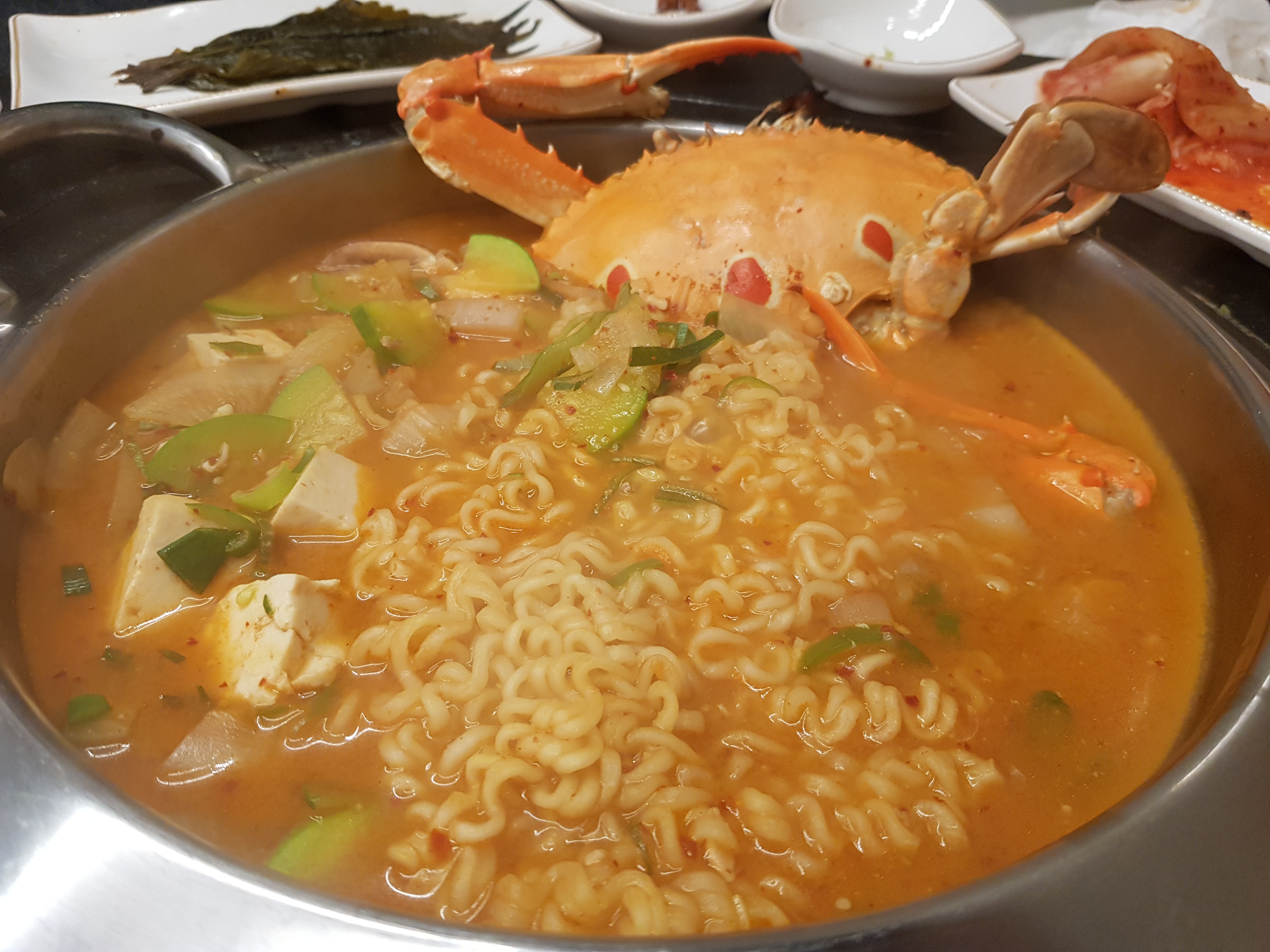 게라면인데 큰 게가 한마리 들어가 있습니다. 라면이라고 하기엔 비쥬얼이 상당히 좋습니다. 꽃게 된장찌개에 라면사리를 넣은 느낌입니다. 된장밥같은 느낌으로 배가 불러도 마무리로 주문을 해줘야 될 것 같은 메뉴입니다. 옆테이블에서 게라면을 먹고 있으면 똑같이 주문하게 되는 메뉴입니다.