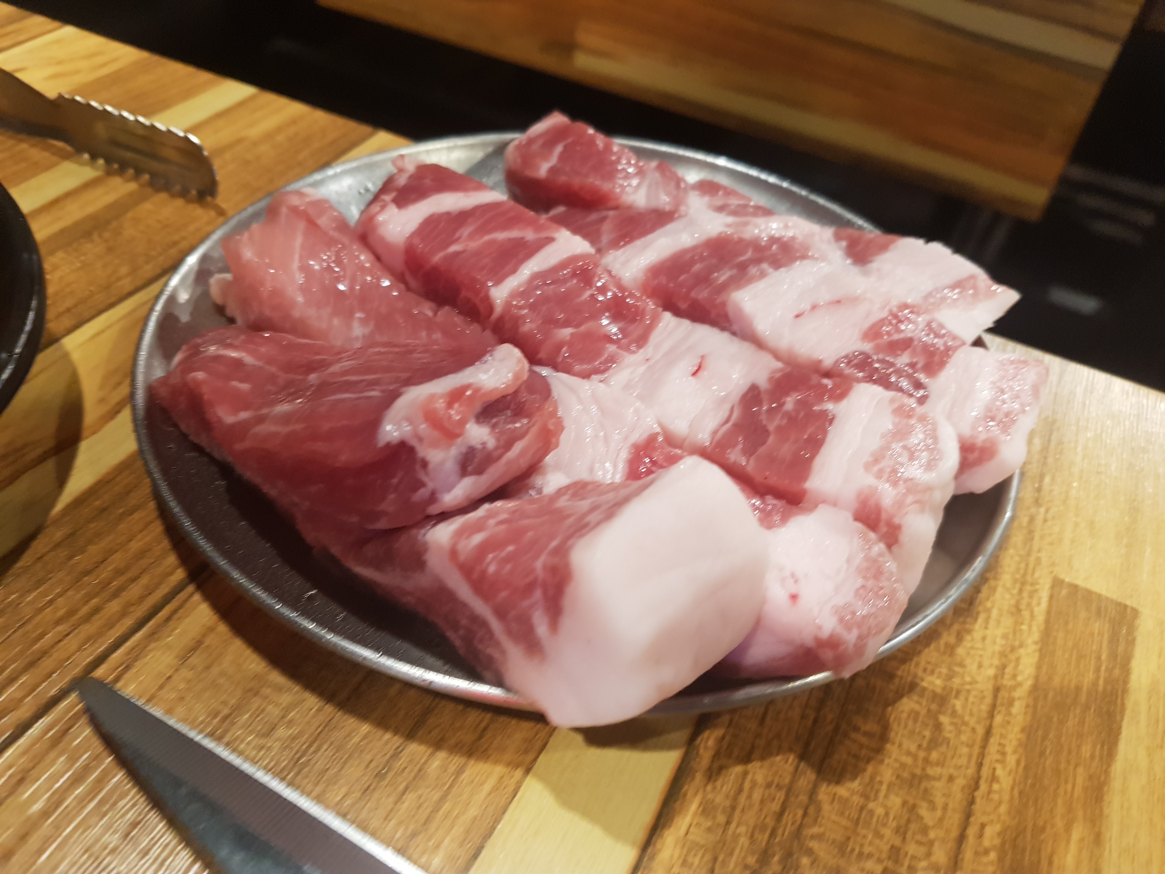 음주를 한다면 약간 기름진 하얀살을 2번째 메뉴로 추천할 수 있습니다. 하얀살이 정확히 어디 부위인지 알려주지 않습니다만 목살보다 더 부드러우면서 기름지고 살짝 양념이 되어 있어 음주와 아주 잘 맞는 고기입니다. 식사로 밥만 먹을때는 기름져 가족들이 목살을 더 먹을걸 했을 정도로 기름진 고기였습니다.