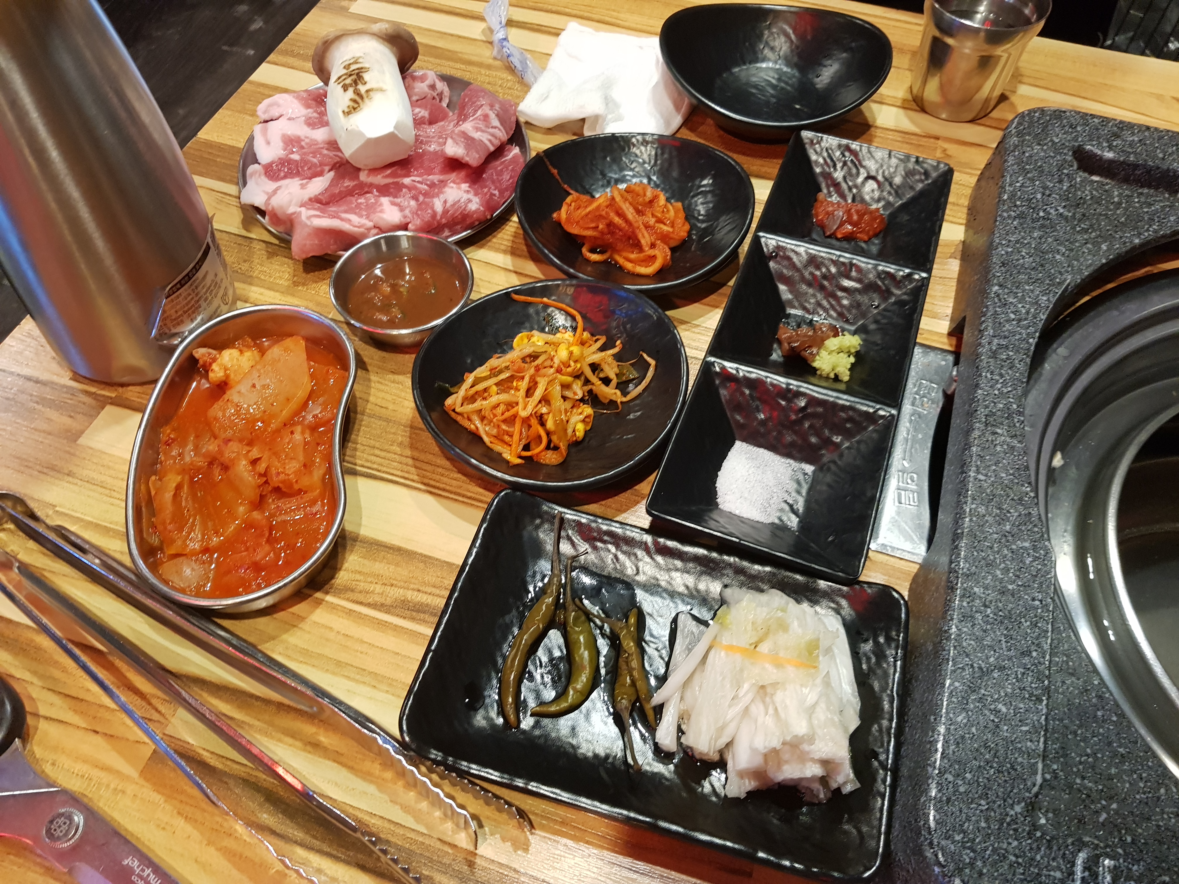 그러면 이제 불판을 올리고 화력이 잠잠해질때까지 기다리는데 이때 김치볶음 접시를 통째로 가장자리에 올려줍니다. 처음 와봤다고 하면 다 알아서 올려주고 추가해주고 하니 불편하지 않습니다.