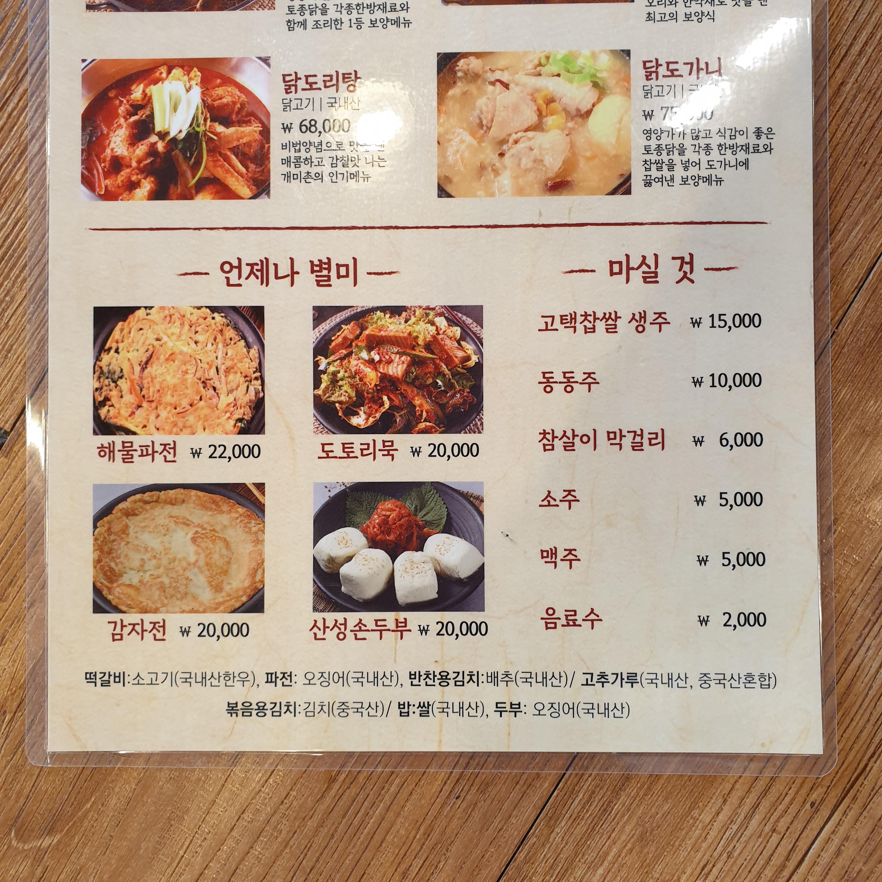 5인 테이블로 2개로 나눠 앉았고 주문은 닭도리탕(68,000원)과 능이오리백숙(88,000원), 공기밥 2개, 소주2병을 주문했습니다. 점원분이 2개를 시켜야 한다고 하는데 메인메뉴1개와 밥을 주문하고 사이드메뉴를 주문해도 충분합니다. 예전에 맛있게 먹었던 닭도리탕과 몸에 좋다는 능이오리백숙을 주문했습니다.