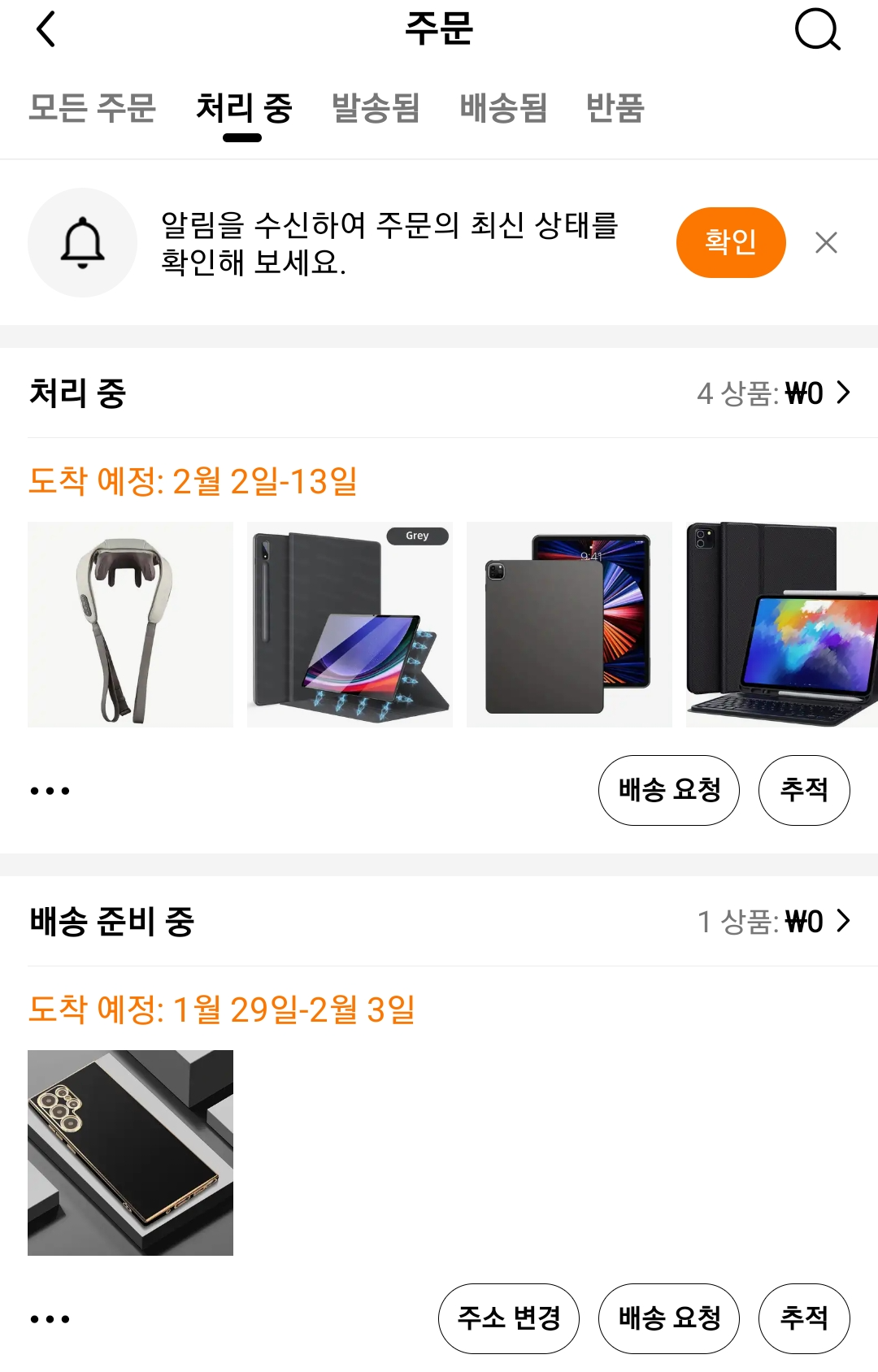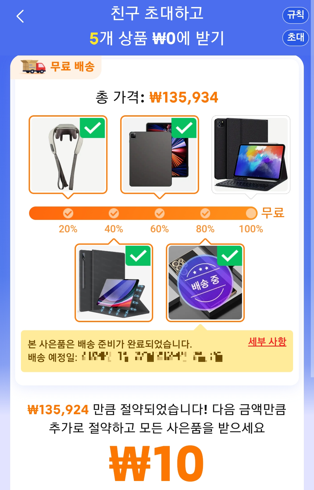 초대 미션을 하고 상품을 선택하여 제품이 실제로 주문이 되는 것을 알 수 있습니다. 상품명은 보이지 않고 아래처럼 이미지만 보이는데 아이패드를 주는 줄 알고 선택을 했습니다. 금액이 보여지는 페이지가 있는데 처음할 때는 눈에 들어오지 않습니다. 그래서 정말 받는것인가?하고 이벤트를 진행을 했는데 이벤트 도중에 3번째 아이템을 먼저 보내주겠다고 하니 더 기대를 하고 열심히 이벤트를 참여했습니다. 아이패드, 갤럭시패드를 하고 나니 선택할 게 없어 싸구려 마사지기나 하나 더 하자고 해서 모두 선택하고 기다렸습니다.