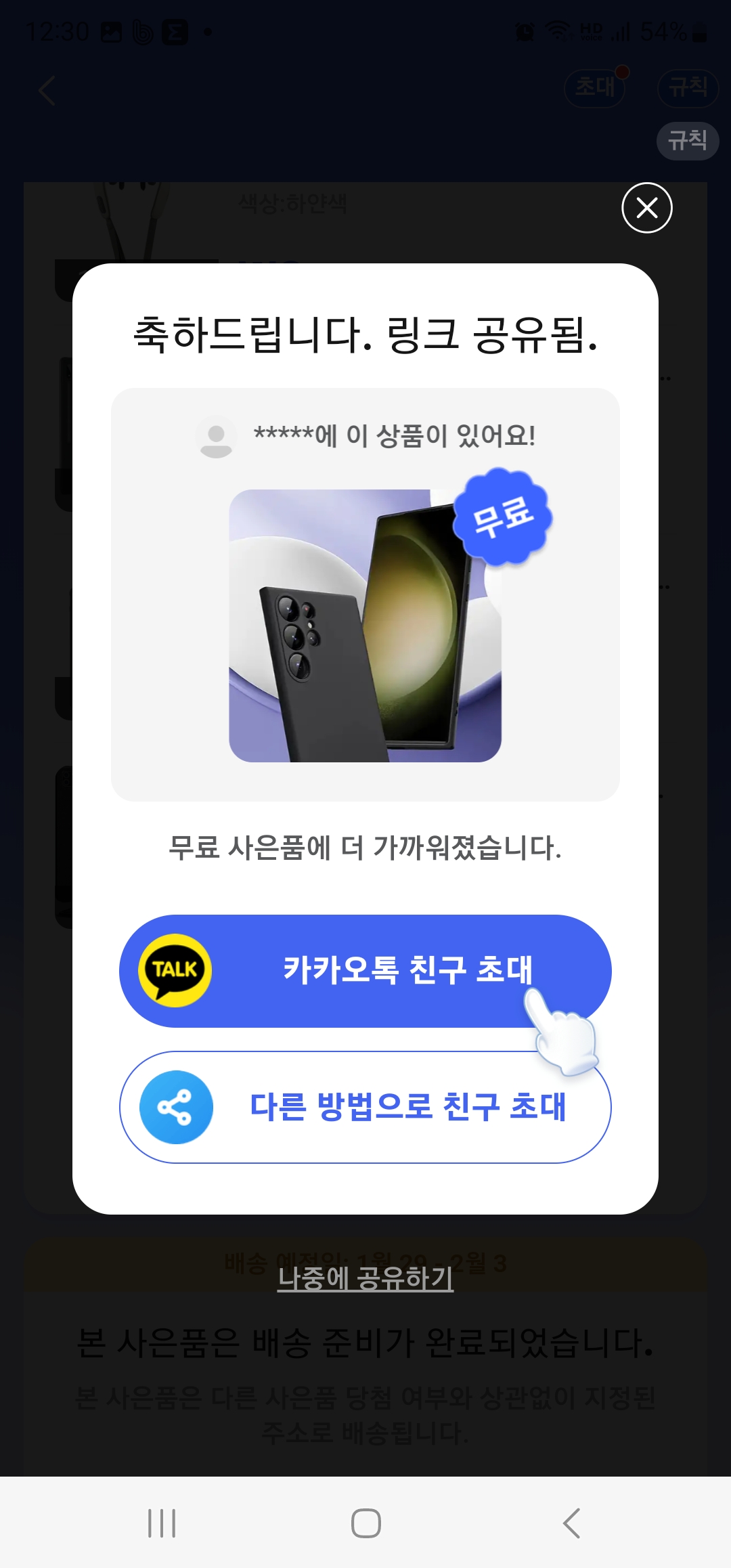 초대 메세지를 카카오톡이나 SMS를 선택한 후 진짜로 보내지 않고 취소합니다.